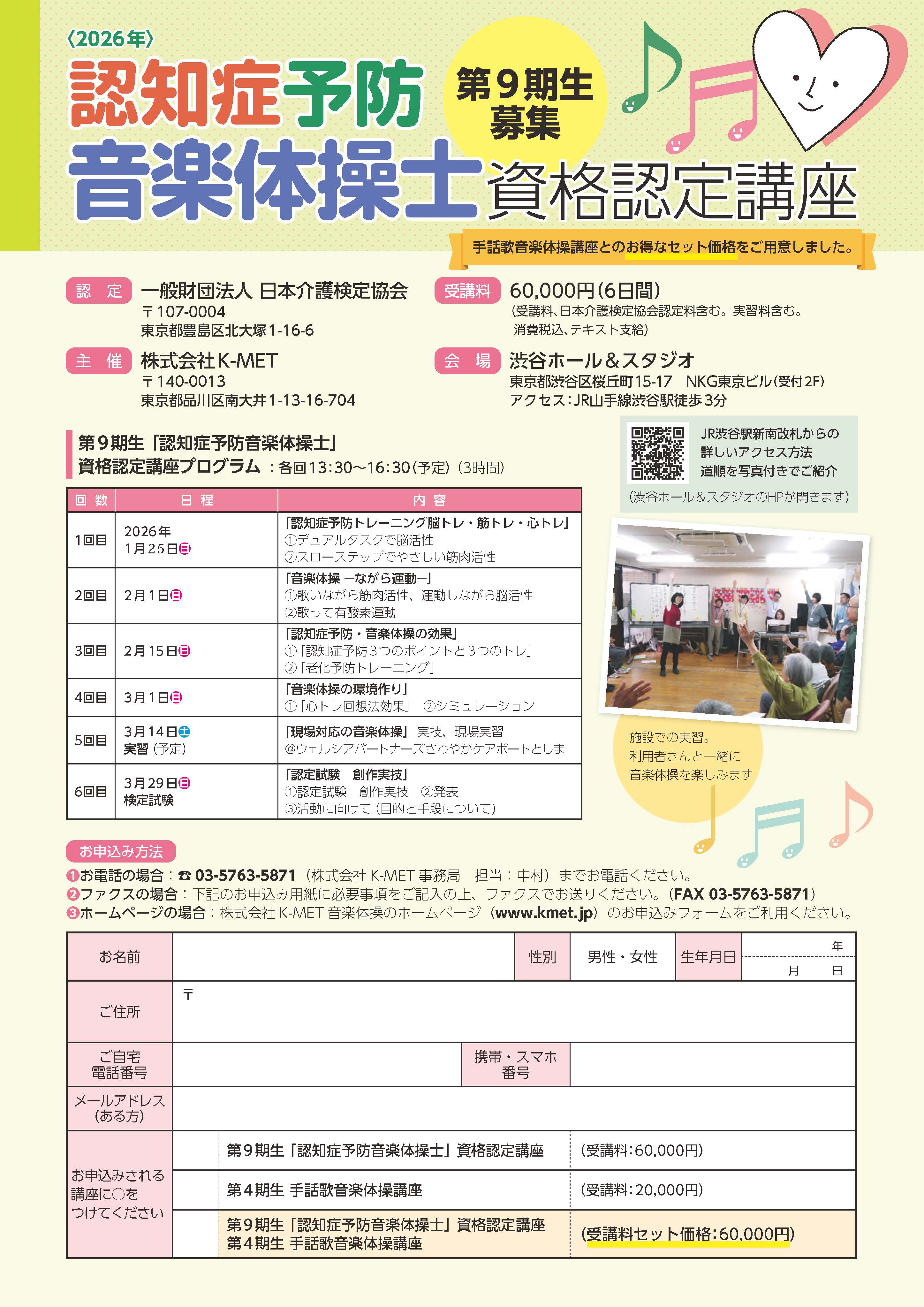 来年2026年度 第9期生 認知症予防 音楽体操士 資格認定講座 受講申し込み・受付開始です! !